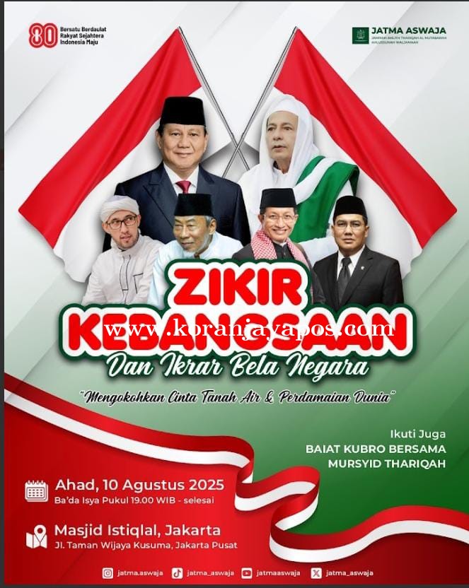 Memperingati 80 tahun kemerdekaan Republik Indonesia, Pengurus Besar Jamiyah Ahlith Tharigah Al Mutabaroh Ahlussunnah Wal Jamaah (PB JATMA ASWAJA) akan menggelar Zikir Kebangsaan dan Ikrar Bela Negara di Masjid